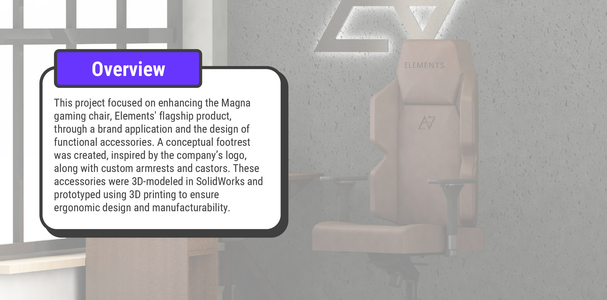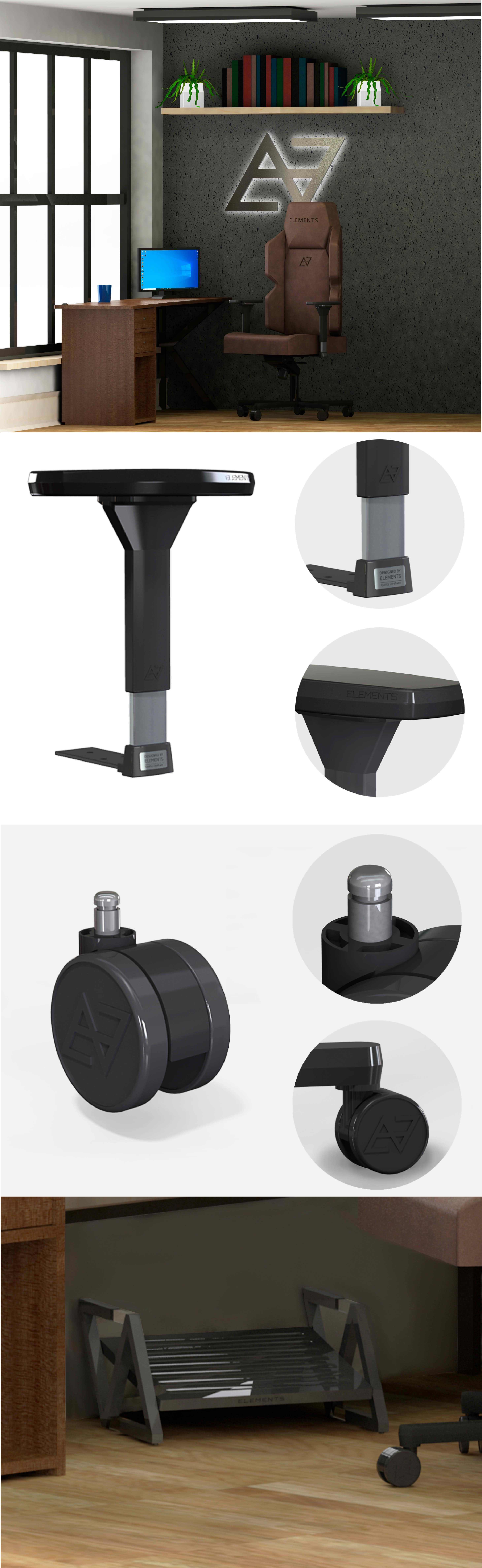 The goal of this project was to enhance the Magna gaming chair by integrating the Elements brand identity into the chair. To create a signature design for the company, custom accessories such as casters, armrests, and a logo-inspired footrest were developed. These elements were designed not only to reinforce brand recognition but also to improve functionality and aesthetics. To ensure feasibility and ergonomic performance, the accessories were 3D-modeled in SolidWorks and prototyped using 3D printing for testing and refinement.